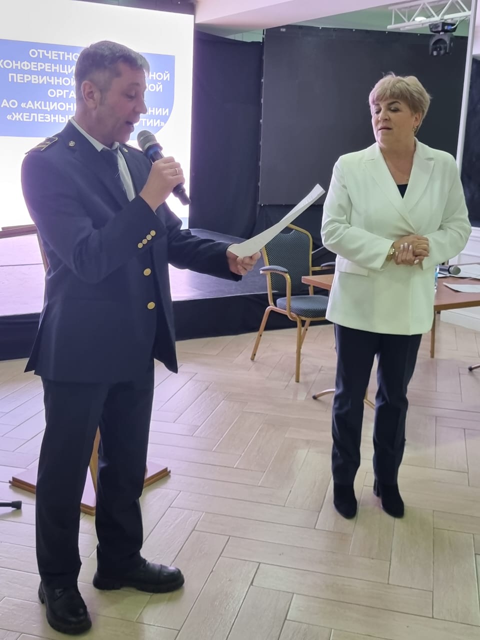 Её доклад был поддержан заместителем генерального директора АО «АК «ЖДЯ» по кадрам и социальным вопросам Владимиром Петровичем Мирошником. Он осветил состояние грузовых и пассажирских перевозок в отчетном году, а также с помощью наглядных диаграмм представил ключевые экономические показатели предприятия, от которых напрямую зависят уровень заработной платы и дальнейшее развитие компании.